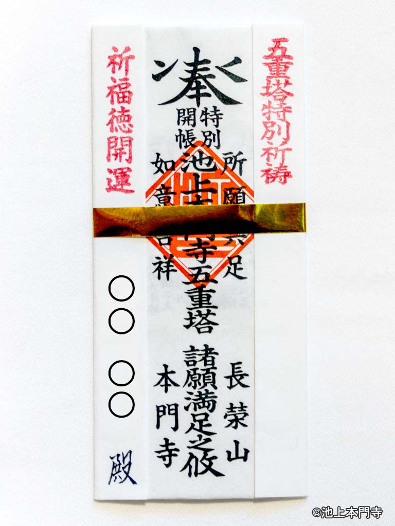 期間中、五重塔正面が開帳され、奉安されている仏様の前で御祈願を受けることが出来ます。併せて四百年超の歴史を誇る五重塔の功徳を込めた五重塔守りと特別限定御朱印の頒布を行います。