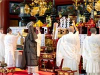 読経に引き続き、山口顯辰学監修法導師のもと本門寺修法師により加持祈祷が捧げられ、百日間の唱題祈願が円満成就出来たことへの感謝を捧げました。その後、菅野貫首がご宝前へ進み、結願文を捧げました。