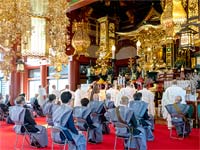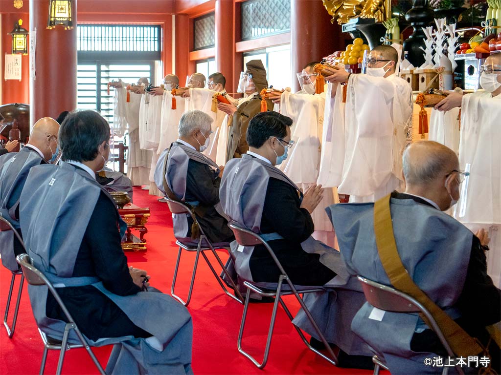 菅野日彰貫首導師のもと池上山内寺院が集い、報恩読経が捧げられました。法要の様子は動画投稿サイトのユーチューブにてライブ配信されました。