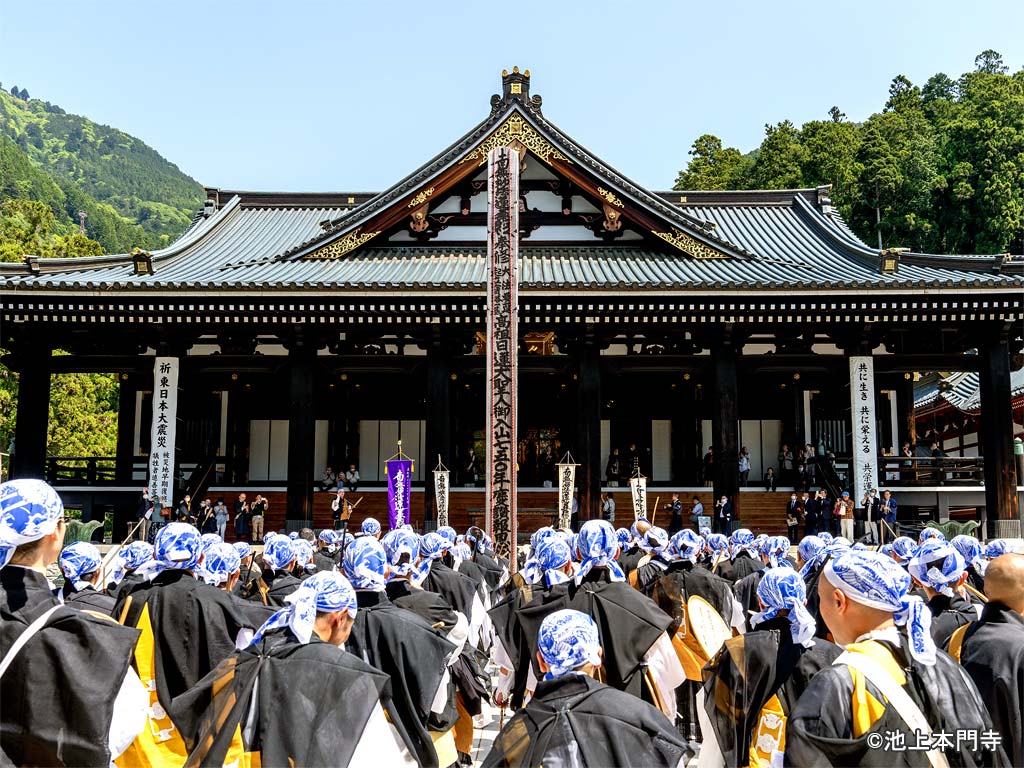 五月十七日(水) 身延山久遠寺の大本堂において日蓮宗主催による日蓮聖人御入山七五〇年報恩宗門法要が営まれ、菅野日彰貫首が日蓮宗第五十五代管長として大導師を務められました。法要には身延山久遠寺内野日総法主猊下、田中恵紳宗務総長をはじめ、全国本山会・宗務内局各聖ご臨席のもと、全国日蓮宗宗務所長、青年会会員、関係各聖が参列する大法要となりました。