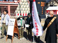 また、今後も継続した募金活動を行うべく、池上本門寺・日蓮宗スカウト連絡協議会・大田第十七団の三者合同で取り組む運びとなりました。2月3日(土)節分追儺式の折には大堂前や総門前、大坊本行寺の境内など五カ所で募金活動を行いました。日蓮宗スカウト連絡協議会から、この活動のために製作した幟の提供があり、また、大坊本行寺中野日演貫首、池上本門寺木内隆志執事長、日蓮宗スカウト連絡協議会会長塚本智秀師もスカウト達と一緒に現場へ立ち、募金の呼びかけを行いました。今後も募金活動を続けて参りますので、皆様からのご支援を何卒お願い申し上げます。