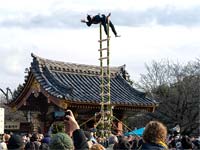 清正公堂前にて一年間の安全を祈る特別祈祷を受けた後、仁王門から大堂前の特設会場まで練り歩きました。特別に誂えられた高さ約6メートルの梯子が垂直に立てられ、鳶職人たちの熟練された技が披露されました。軽快な身のこなしで梯子を駆け上り、頂上では息をのむような数々の妙技が繰り広げられ、参拝者からは感嘆と賞賛の声が沸き起こりました。最後は上から縁起の良いお菓子が撒かれ、参拝者たちは手を伸ばし、新年の喜びを分かち合いました。お菓子まきの後には子供たちを対象とした体験会も開かれ、子供たちは練習用の梯子に挑戦し、鳶職人から手ほどきを受けていました。