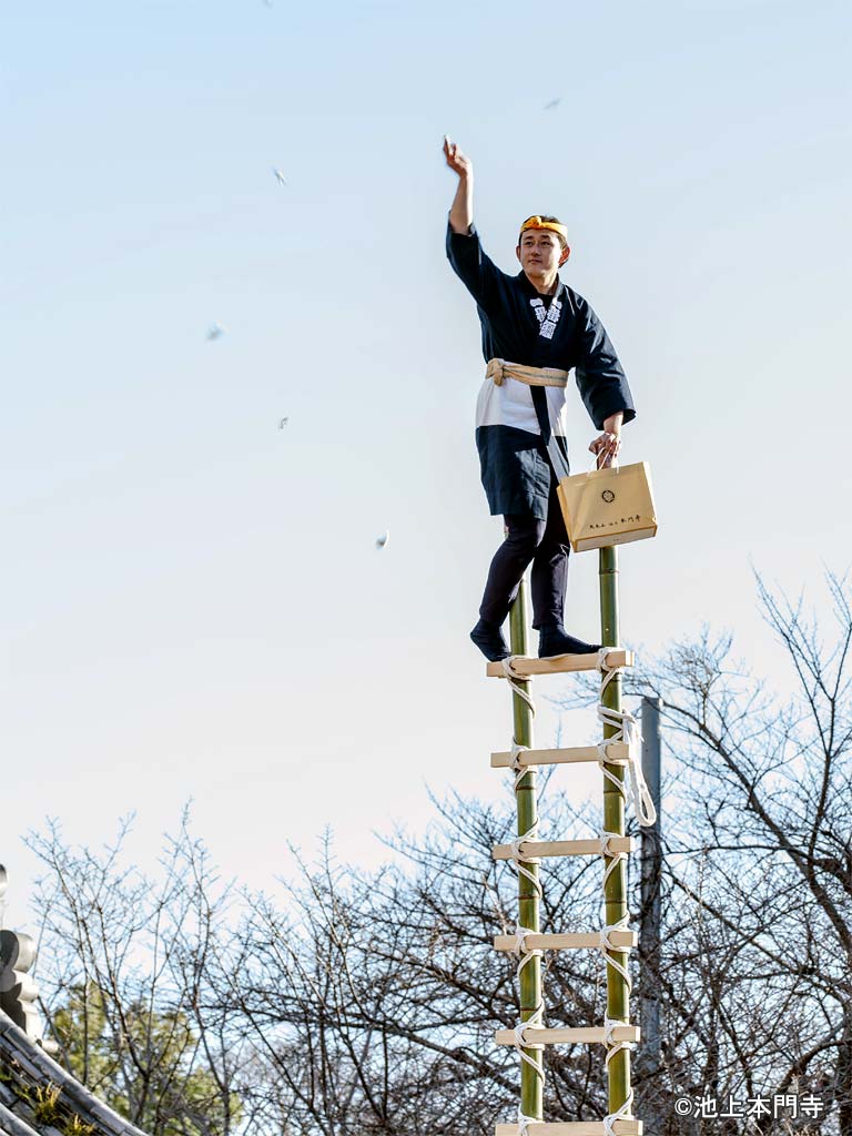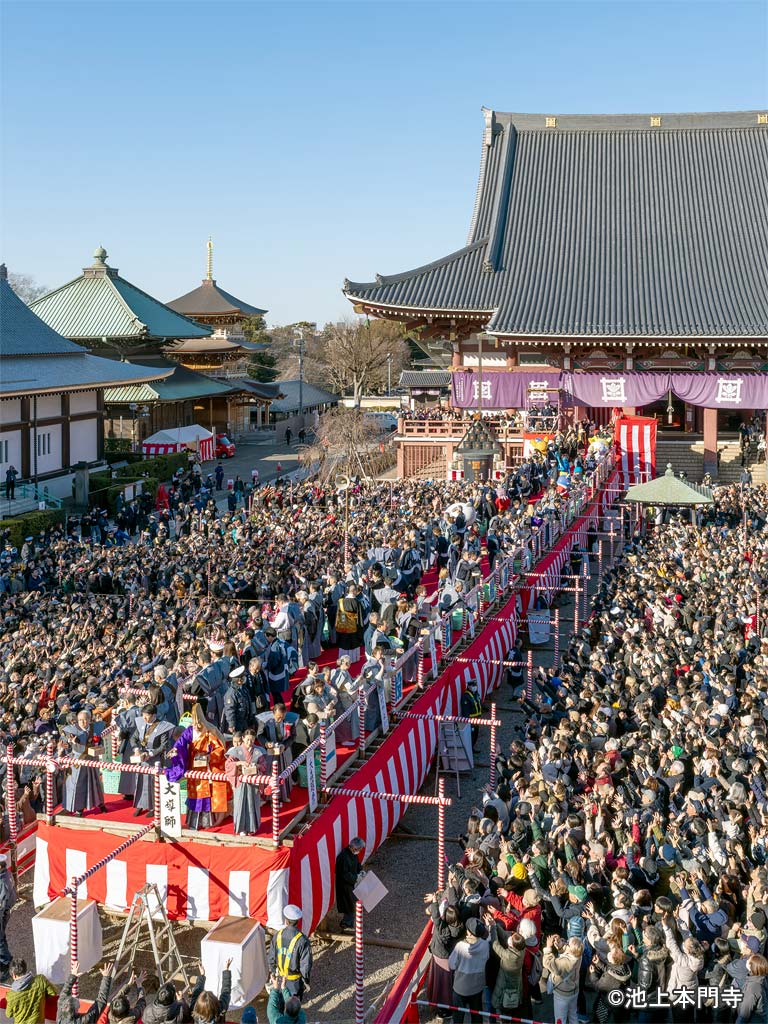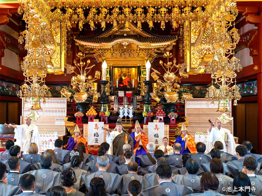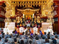 今年一年の無病息災と開運招福が祈念され、午後3時から参列者全員で大堂前特設舞台へ進み、盛大な豆まきが行われました。